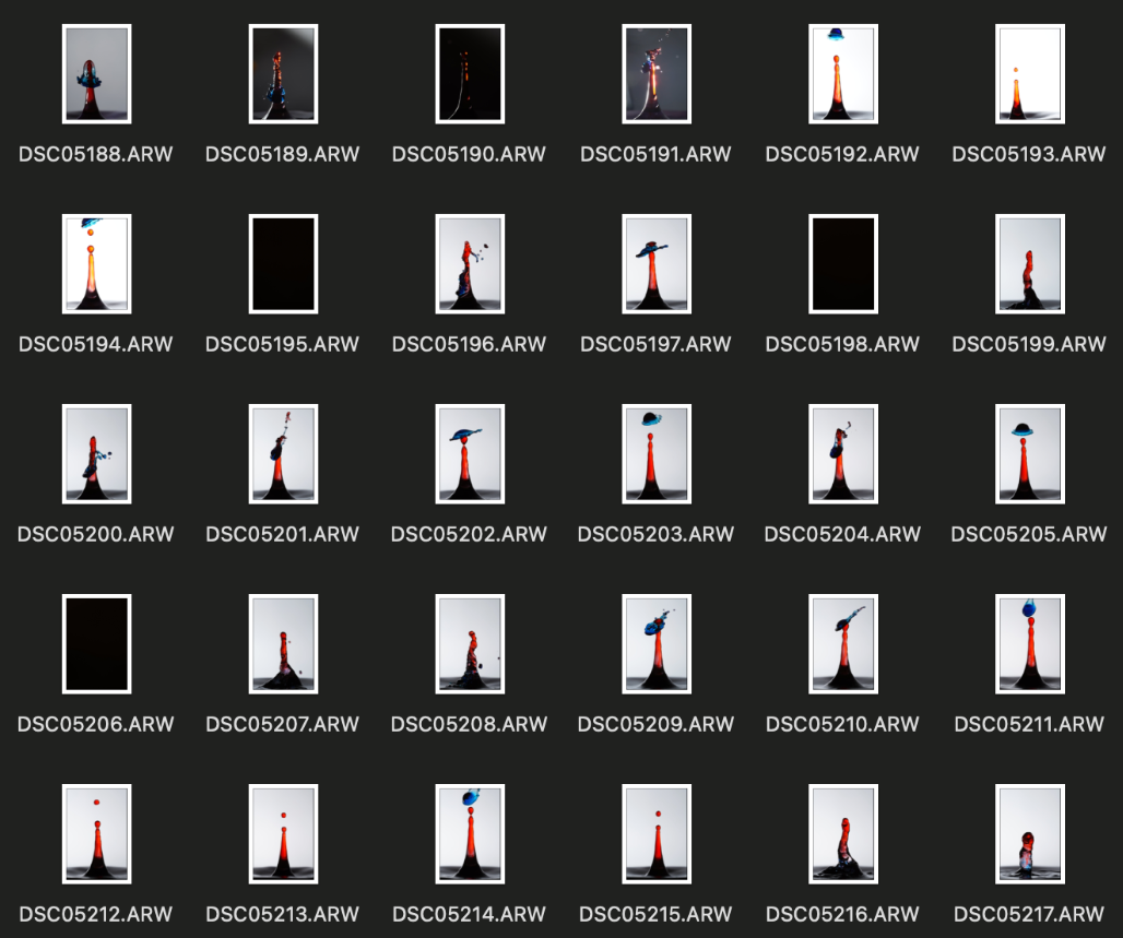 The photos above show 30 consecutive images from the dropper. It is incredibly repeatable, with the only issues being cause by user error (me forgetting to click the shutter before the flash went off)