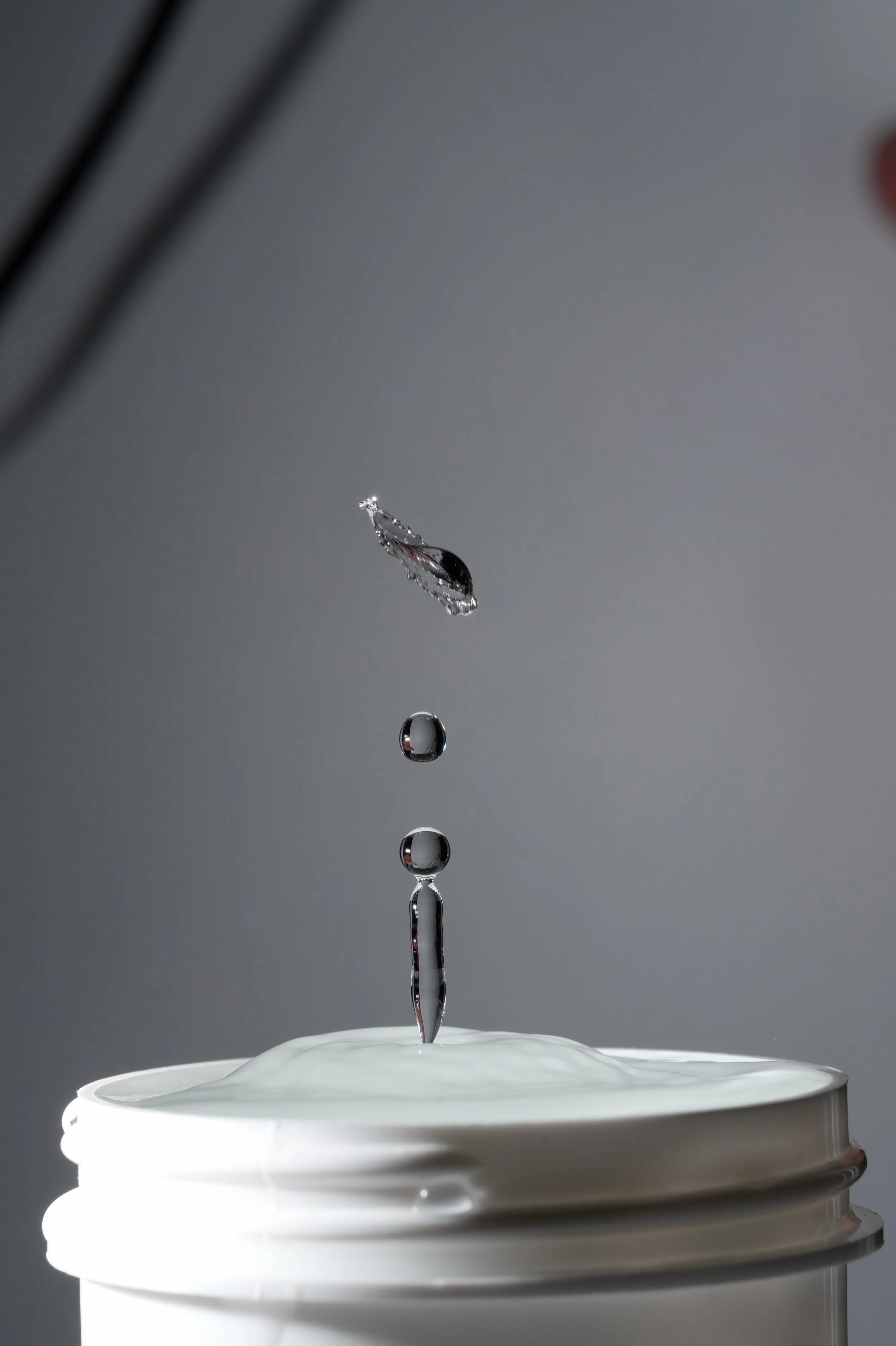 With consistent photos of the first droplet established, we started trying to drop the second drop from a higher nozzle and dodge the lower nozzle out of the way.