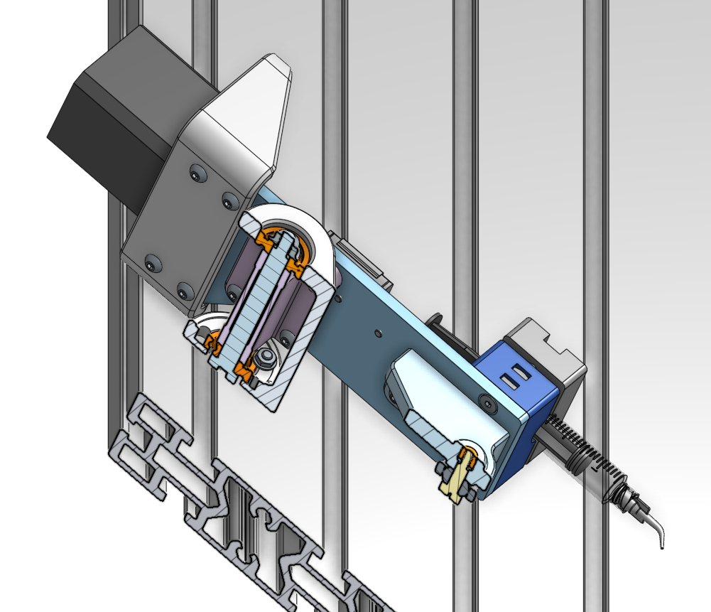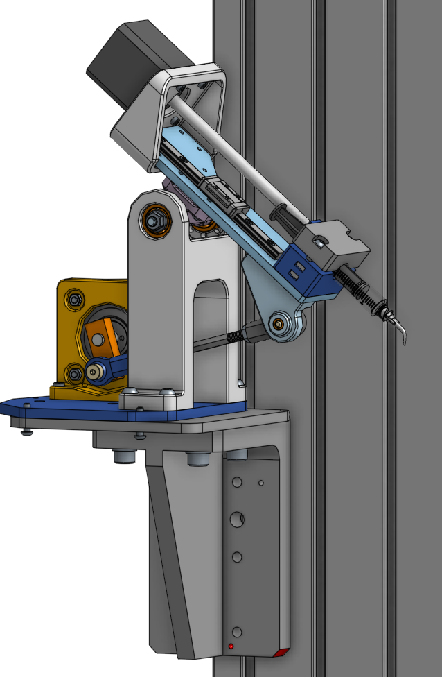 Details of the pivoting components. The primary pivot point is accomplished with a long shoulder screw and nut preloading the inner races of two bearings against a pivot bracket. The other point that connects the linkage does not require the same precision and is downgraded to a less exciting shoulder screw + ball joint rod end.