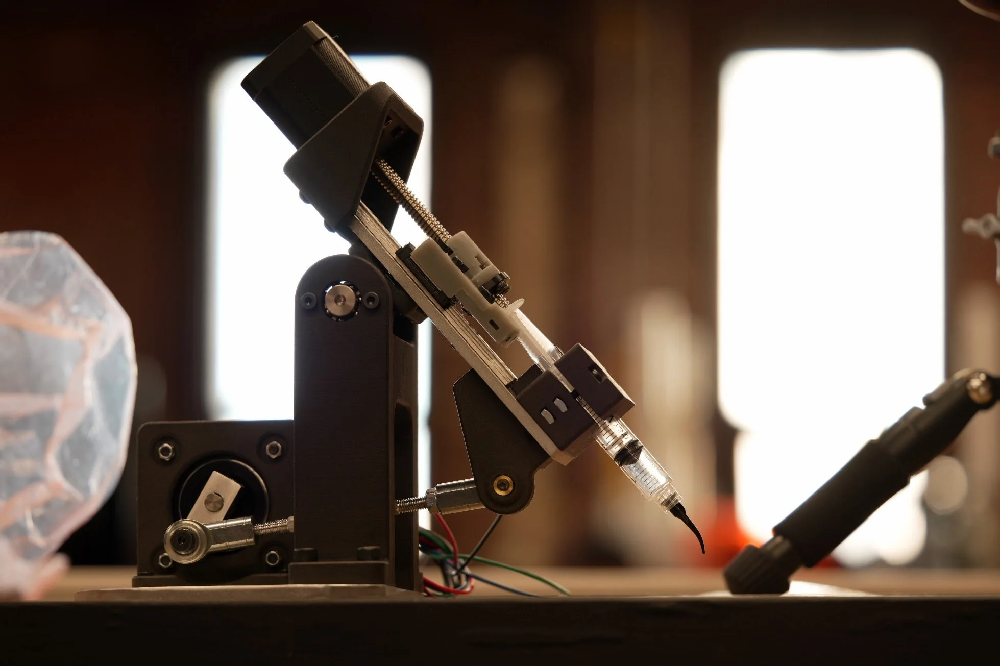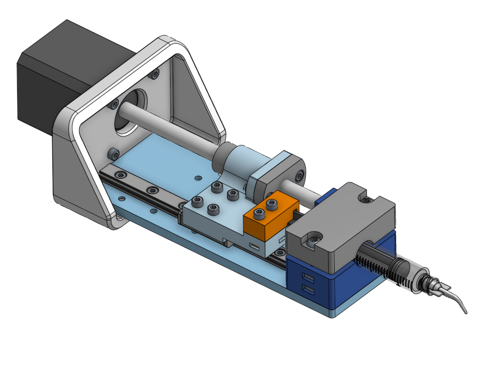 Piston pump details. Nothing too exciting going on here. Main focuses were to keep things dead simple and modular so different syringes could be tested.