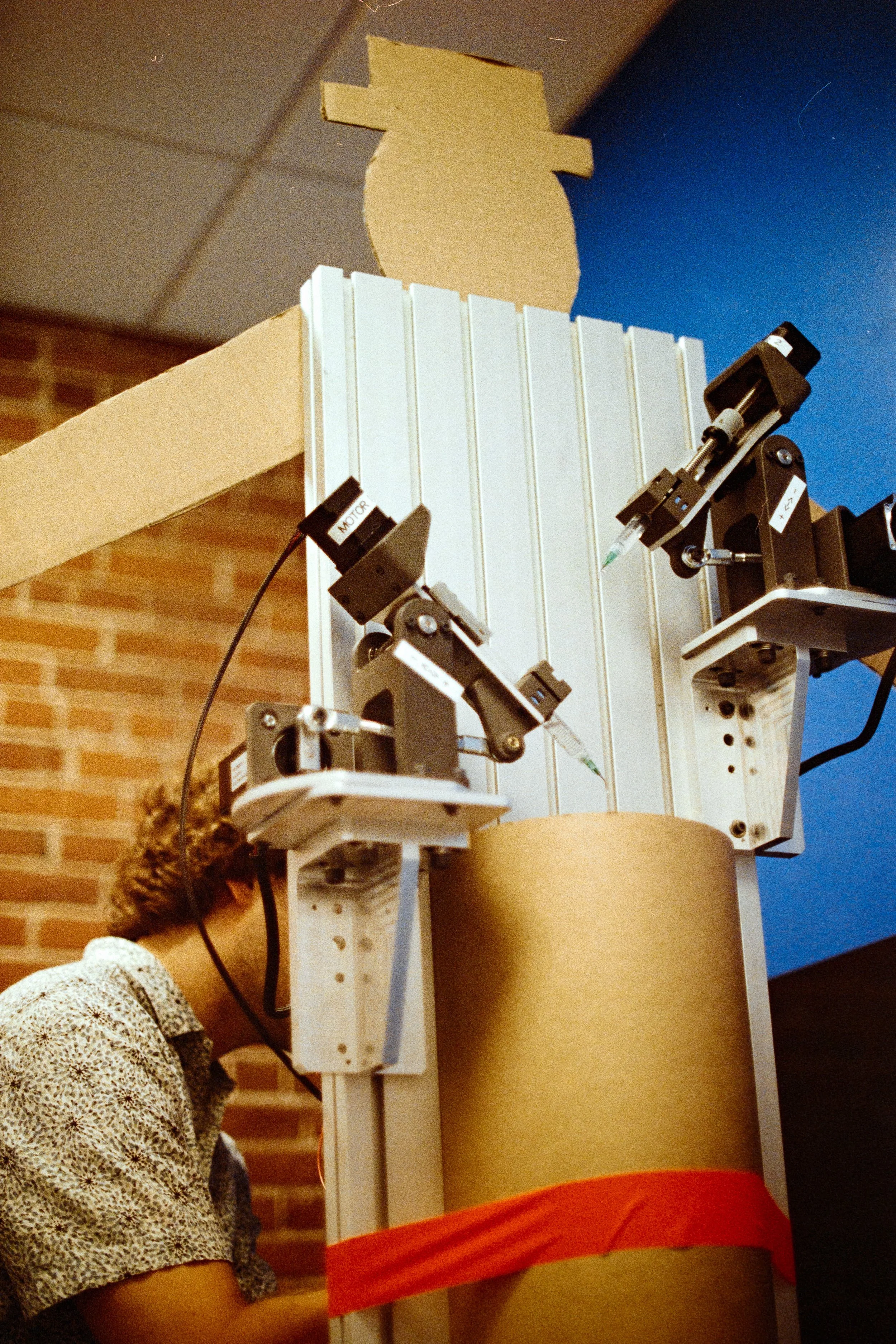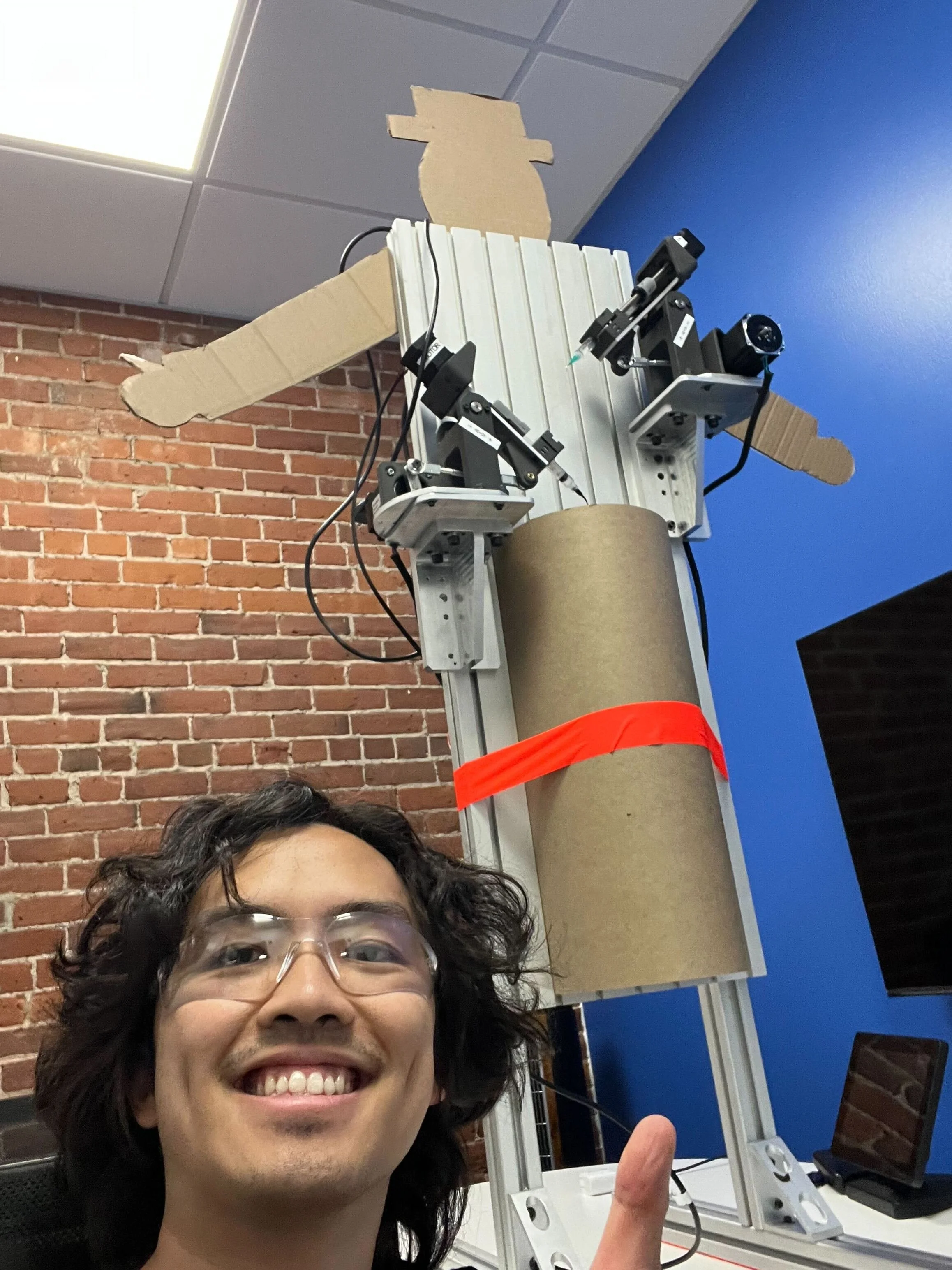 Sam debugging our stepper drivers after our motors decided to stop working. Our initial drops seemed to not be landing consistently which we attributed to the HVAC in the room. A large cardboard tube seemed to eliminate the issue completely.