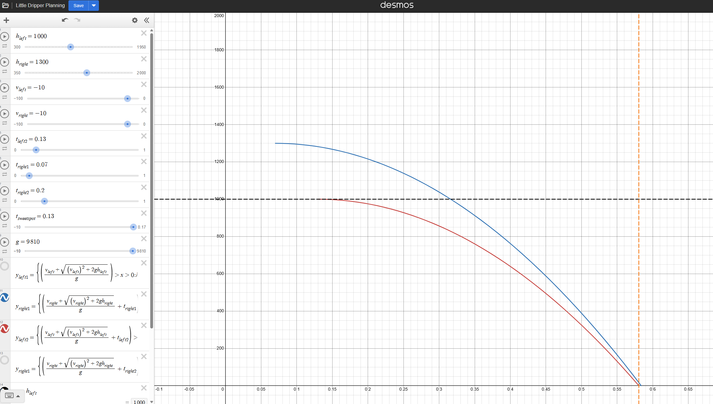 To check that this plan in my head was feasible at all I made a basic Desmos calculator to see how quickly I’d have to “dodge” the lower nozzle away, and to see how mismatching the heights of the two nozzles could increase the dodge window.