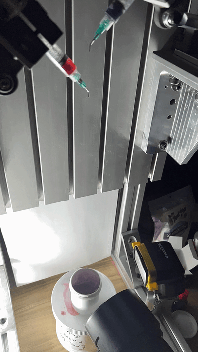 The big question to solve when thinking about this idea was “How do you drop two liquids on the exact same axis without the lower nozzle being in the way of the upper one?” I originally toyed with the idea of angling the nozzles, but there was something perfect about the idea of a purely vertical drop that was too compelling to ignore.