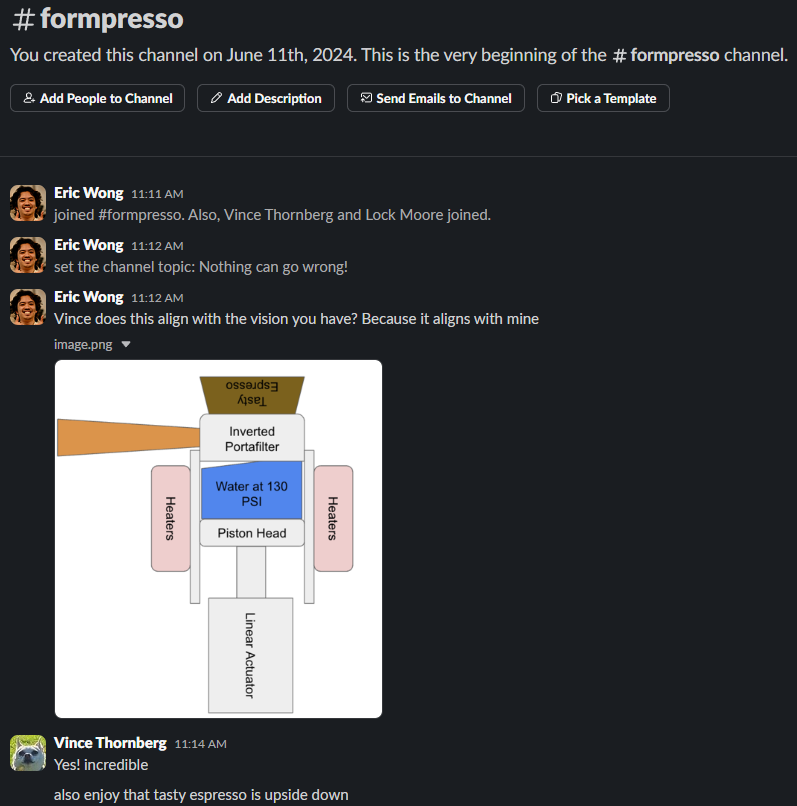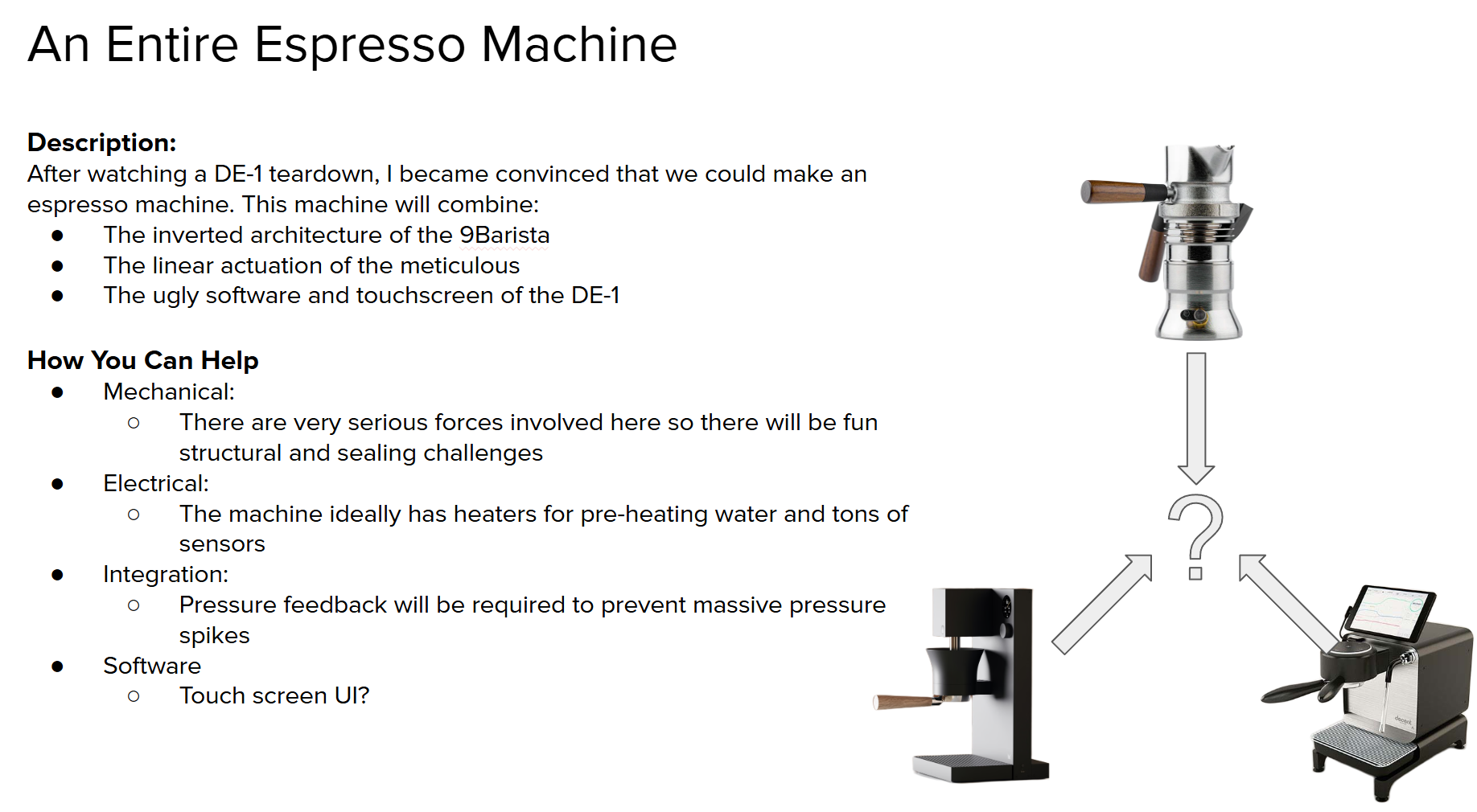 I felt that there could be an interesting marriage of concepts from all three of the machines involving the inverted nature of the 9Barista, the linear actuation of the Meticulous, and the profiling capabilities of the Decent. And so, I threw this slide onto a hackathon pitch deck, managed to get a large team, and started designing.